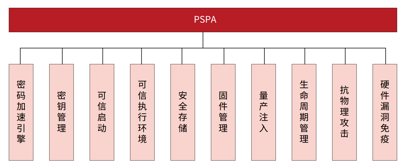 從十個方面定義安全處理器中設計的軟硬件功能和屬性,即:密碼加速引擎、密鑰管理、可信啟動、可信執行環境、安全存儲、固件管理、